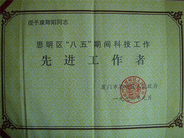 康輝陽(yáng)同志1996年思明區“八五”期間科技工作先進(jìn)工作者
