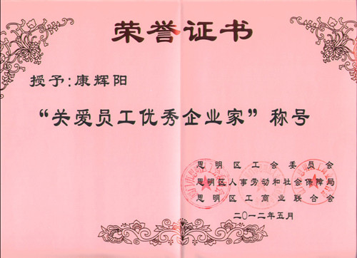 康輝陽(yáng)同志2012年廈門(mén)市關(guān)愛(ài)員工優(yōu)秀企業(yè)家稱(chēng)號