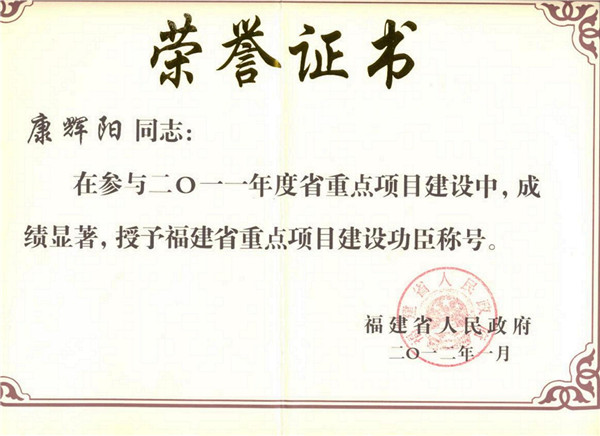 康輝陽(yáng)同志2011年度福建省重點(diǎn)項目建設功臣