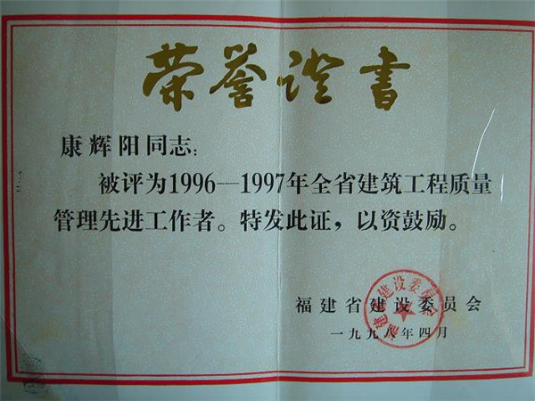 康輝陽(yáng)同志1996-1997年度全省建筑工程質(zhì)量管理先進(jìn)工作者