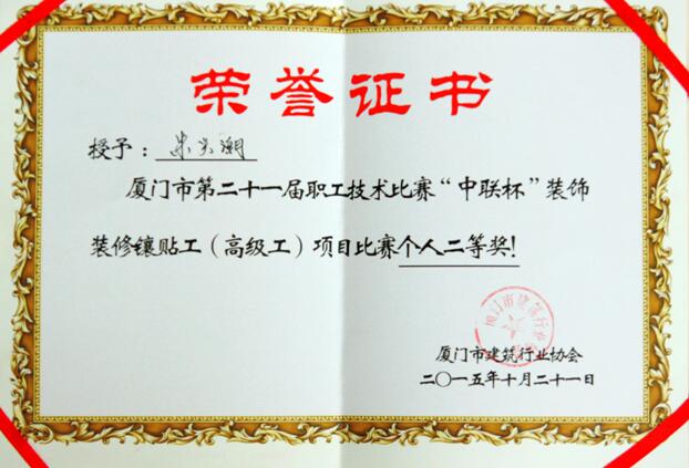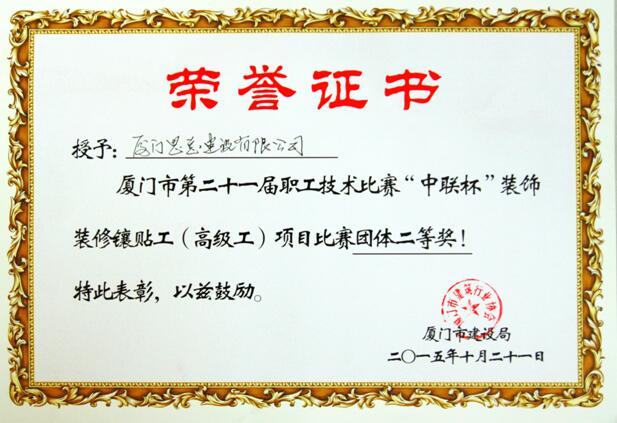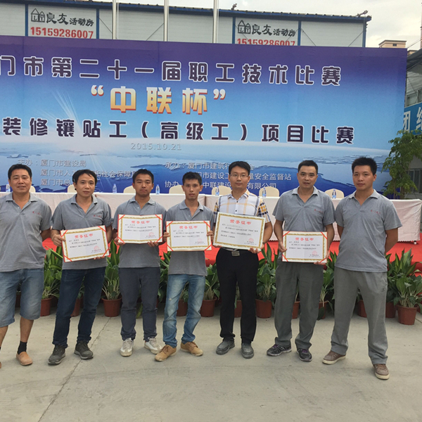 20151021日上午,由廈門(mén)市建設局、市人力資源和社會(huì )保障局、市總工會(huì )主辦,廈門(mén)市建筑行業(yè)協(xié)會(huì )、市建筑工程質(zhì)量安全監督站、廈門(mén)中聯(lián)建設工程有限公司承辦的廈門(mén)市第二十一屆職工技術(shù)比賽“中聯(lián)杯”裝飾裝修鑲貼工(高級工)項目比賽實(shí)操考核環(huán)節在同安區禹洲溪堤尚城7#地塊隆重舉行,我司代表隊參賽并獲佳績(jì)。