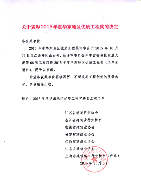 “華東杯”優(yōu)質(zhì)工程獎作為華東地區六省一市建設工程質(zhì)量最高榮譽(yù)獎,旨在增強質(zhì)量意識,爭創(chuàng )優(yōu)質(zhì)工程,推動(dòng)建設工程質(zhì)量水平的提高。該獎項堅持優(yōu)中選優(yōu)的原則,從2013年開(kāi)始每年評審一次。