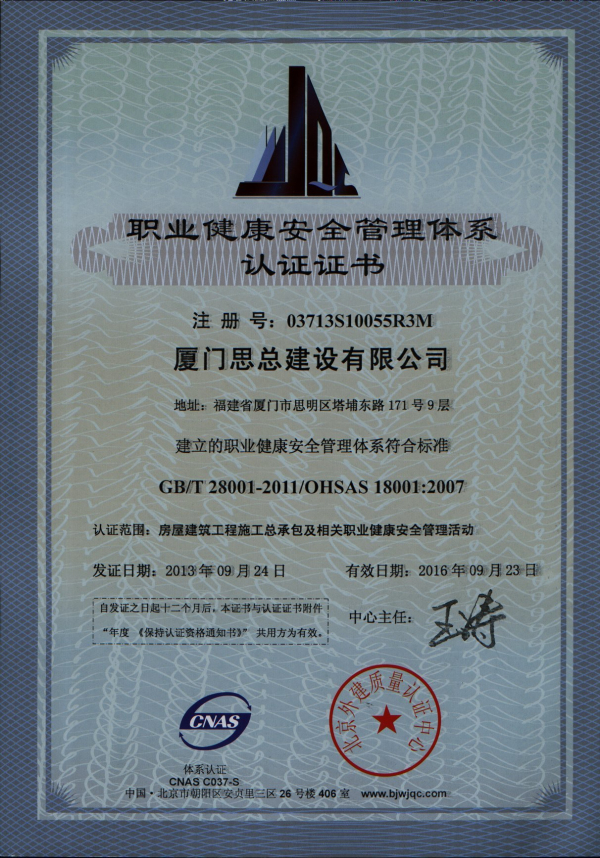 2013職業(yè)健康安全管理體系認證證書(shū)